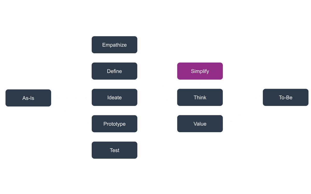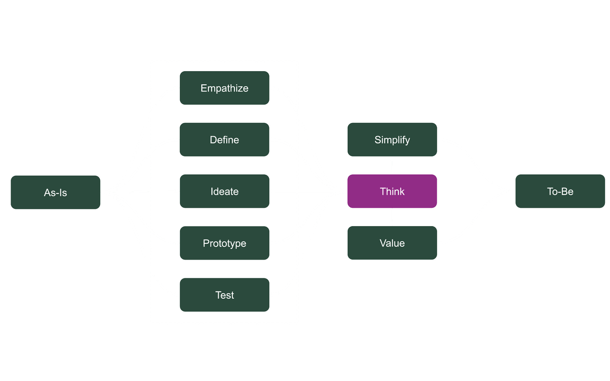 In complex industries, there is a compelling need to innovate. An early step we take to innovate with no-code is to Think. This is applying Design Thinking in five stages, as defined by the Stanford d.school1: Empathize; Define; Ideate; Prototype; and Test.