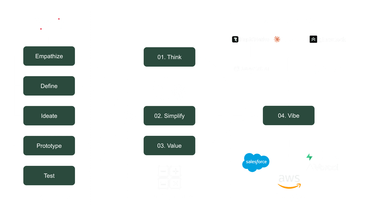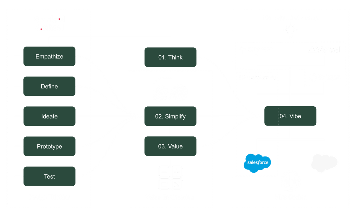Our four step approach means starting with Think: Design Thinking to maximise receptivity, rapport and trust. We then Simplify, with Fierce Reduction to subtract before we add. Value generates a solid financial argument from Value Engineering to determine the gains from Vibe Coding (or not).