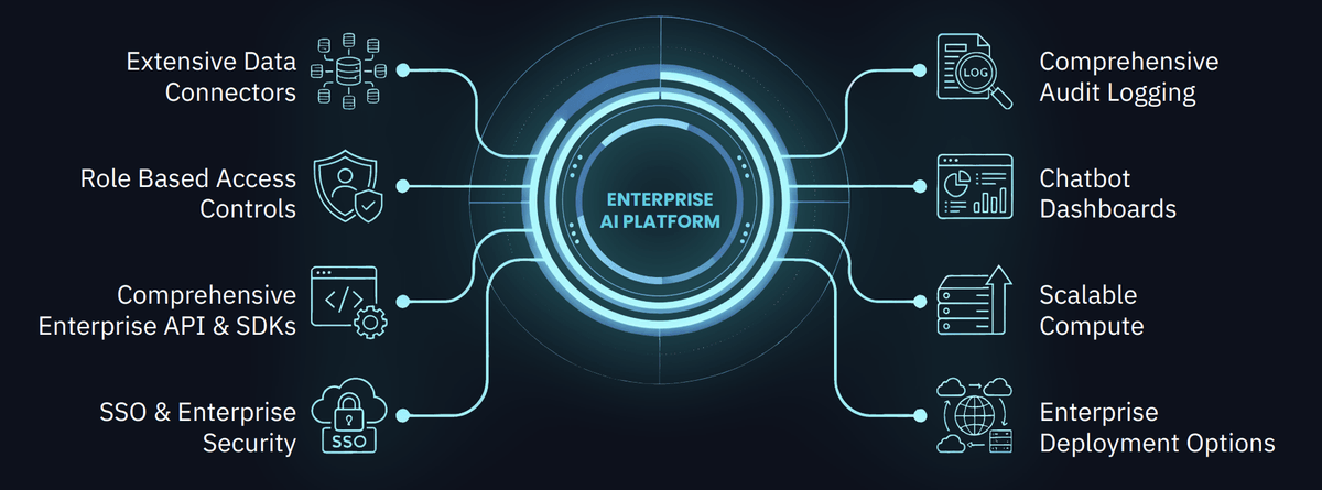 Automate workflows in the enterprise. Orchestrate across best-in-class Large Language Models (LLMs). Enable Role-based Human and LLM Access Controls. Encryted with SOC-2 Type 2 security.